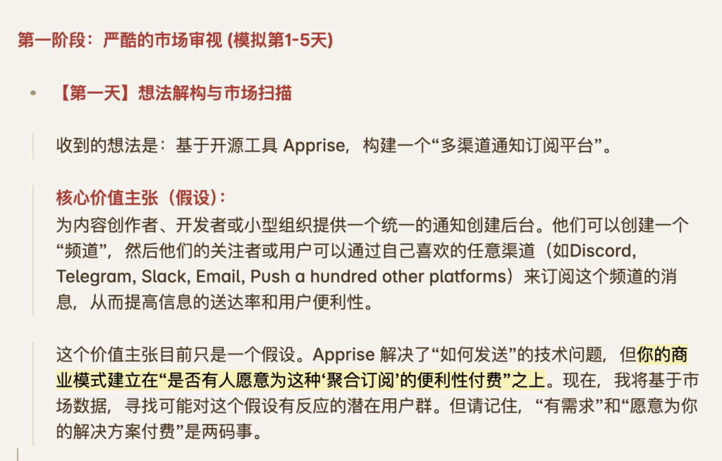 * **优化建议:** 给出针对性的、可操作的建议。例如:“在写第一行代码前,先创建一个预售页面,看是否有人愿意支付10元定金来验证付费意愿。”或“放弃广撒网的社区推广,改为一对一地联系潜在用户,用‘手工作业’的方式获取前10个种子用户。”