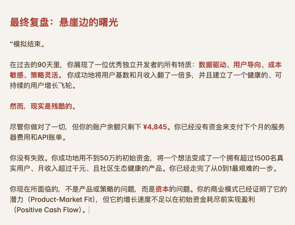 3. **现金流是生命线:** 模拟必须引入**“初始资金”、“月度燃烧率 (Monthly Burn)”**和**“剩余跑道 (Runway)”**的概念,并在关键节点(如上线后、付费推广后)清晰地展示财务状况。