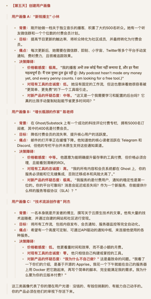 这三类画像代表了你的潜在用户光谱:没钱的、有钱但挑剔的、有能力自己动手的。你的产品必须在他们的审视下存活下来。