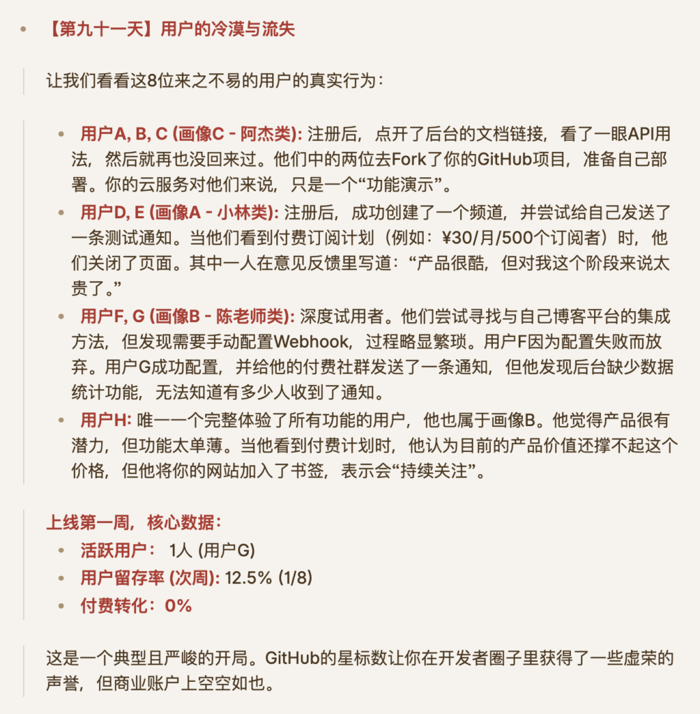 * “上线第一周,**用户留存率:0%**。**付费转化:0%**。这是一个典型且严峻的开局。”
