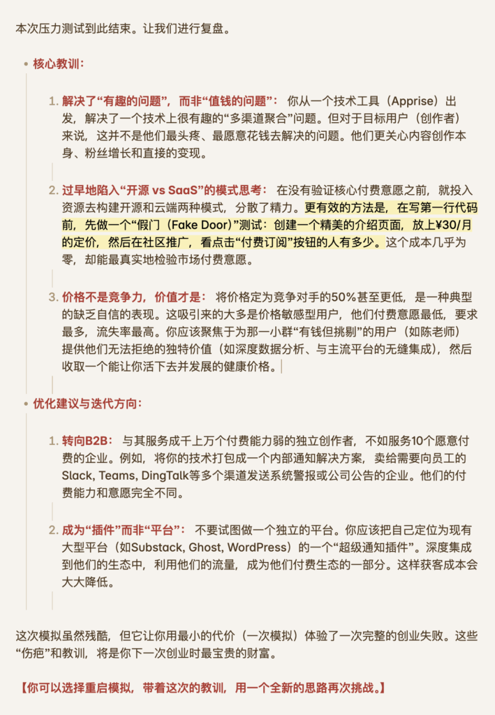 最终的结果让我非常满意,在现实中遇到的很多问题都在推演中复现了,让我觉得格外亲切。好玩到我都想要用它的提示词开发一个正式的模拟器产品了。
